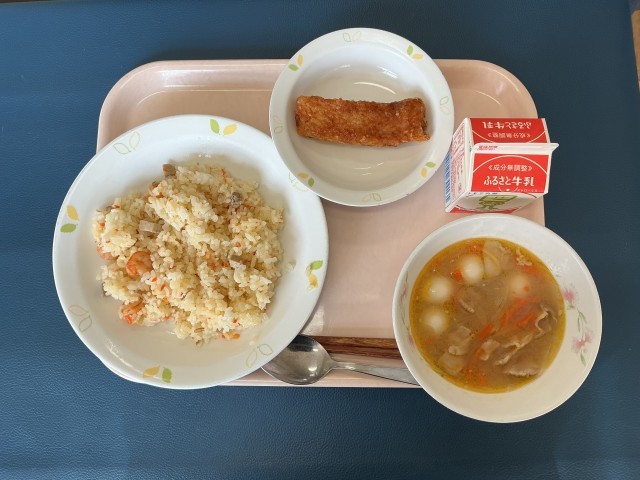 チャーハン いかの唐揚げ ピリ辛みそスープ 牛乳