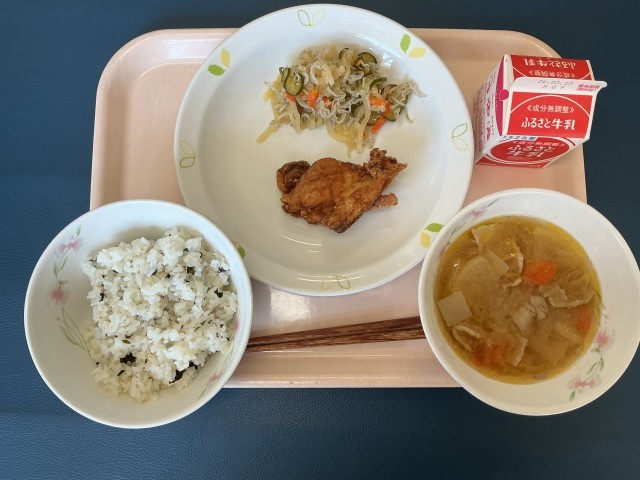 わかめごはん 鶏のから揚げ 大根とじゃこのカリカリサラダ 豚汁 牛乳