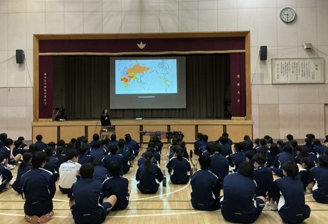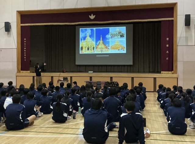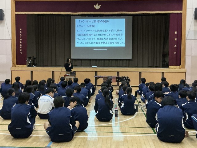 道徳授業 生命の尊さ(2学年) 公開日 2026/03/24 更新日 2026/03/24 できごと 本日の1時間目は、「平和ってなに?」をテーマにした2学年全体道徳の授業を行いました。美術科主任教諭の日本人学校での勤務経験をふまえ、ミャンマーという国についての現状紹介もあり、現在の日本の状況を客観的に見つめ直す機会となりました。世界では戦争の影響を受け、尊い命が奪われる現状もあります。これからの世界に生きる生徒の皆さんに考えてほしいことがたくさん詰まった授業でした。 +1