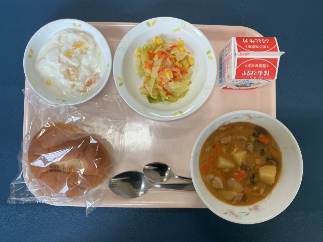 ミルクパン ポークシチュー コーンサラダ フルーツのヨーグルトがけ 牛乳