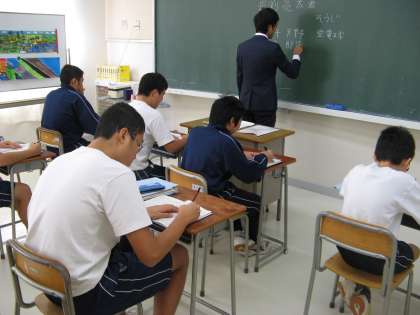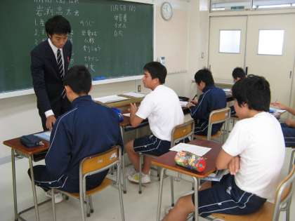 小数の掛け算・割り算の授業で、段階ごとにワークシートが用意され、先生のアドバイスを受けながら、生徒は課題に取り組んでいました。採点時には「(全て正解で)やったー」「(間違って)うわぁー」などの歓声があがるほど熱心に授業を受けていました。
