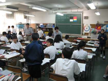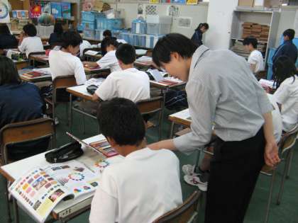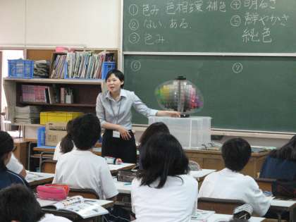 教育実習生の美術の研究授業が、6月9日(月)に行われました。1年生で授業は行われ、色彩について学習しました。生徒たちは、色の三属性(色相・明度・彩度)や色の対比などを、ワークシートを用い、実際に色鉛筆で色を塗って学習していました。