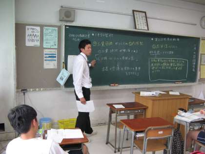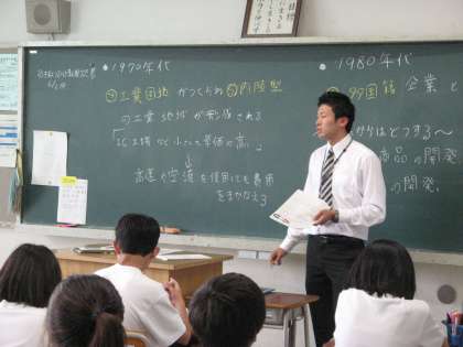 教育実習生の社会の研究授業が、6月9日(月)に行われました。2年生で授業は行われ、日本の工業の特色と移り変わりについて学習しました。生徒たちは、2枚のワークシートを用い、加工貿易・日本の工業ベルト・内陸型工業団地・多国籍企業などについて学習していました。