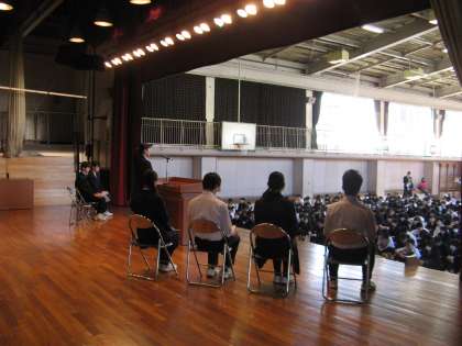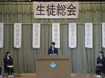 11月17日に、後期生徒総会が開催されました。各専門員会から、後期の活動目標や方針が打ち出され、全校生徒に承認されました。後期は2年生が各委員会の委員長となり、専門委員会が運営されます。部活動や委員会も3年生から2年生に代替わりとなりました。3年生は自分達の目標実現に向け、2年生・1年生は更なる飛躍を目指し活躍してくれることを期待しています。