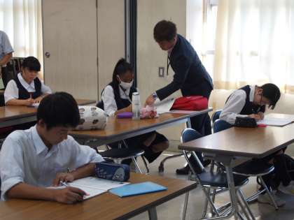 本日、9月12日(土)から3年生土曜講習会が始まりました。今日を含め12回の講習を行います。数学と英語の2教科ですが、本校では教育委員会のご配慮により、各教科とも発展クラスと基礎クラスの2クラスで講習を行っています。受講した生徒は皆真剣な眼差しで講議を受けていました。生徒たちにとり、学力の基礎固めや向上に役立てばと願っています。