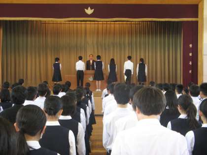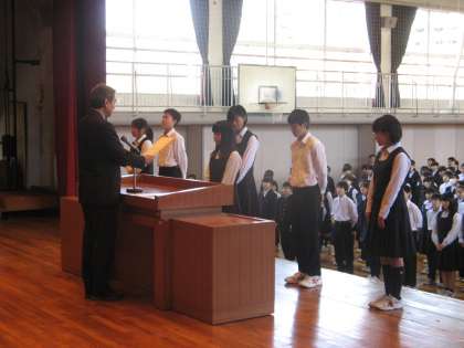 4月25日(月)の生徒朝会において、各委員会の委員長任命式を行いました。一人ひとり校長から任命状授与とともに任命され、所信表明を行いました。生徒会・委員会活動は、学校生活を円滑にかつ快適に送るために不可欠であり、大切な自治活動の一つです。松沢中の充実した学校生活の構築のため、委員長を筆頭に各委員の活躍を期待しています。