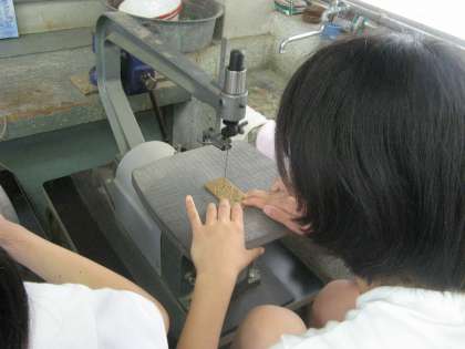 今後折をみて、松沢中の授業風景もお知らせできればと考えています。今回は、技術(2年生)の授業をお知らせします。今、2年生技術は金属加工の授業を行っています。40mm×80mmの真鍮板に、糸のこ・電動糸のこ・ボール盤などを用いて、自らデザインした形に細工をしています。生徒は真剣に作品制作に取り組んでいました。最終的にはペンスタンドができあがるそうです。作品展示も予定してますので、力作を楽しみにしてください。