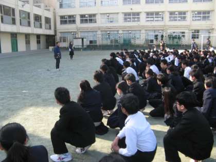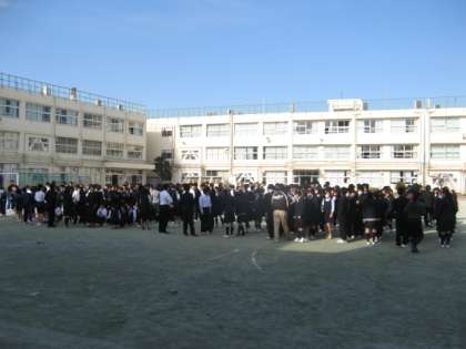 1月19日(木)の昼休みに、告知なしの避難訓練を行いました。普通、避難訓練は授業中に行い、先生の誘導のもと安全な場所に避難を行います。しかし、今回は昼休み中に先生の誘導なしで、いつも通りの校庭に避難をすることを目的に行いました。昼休みゆえ、生徒たちは校庭や教室・廊下などまちまちの場所で過ごしています。生徒たちは、地震発生の放送により机下避難や校庭の中央に集まり、最後校庭にて集合し人員点呼を行いました。このような避難訓練の実施により、どのような状況下においても対応できる生徒の危機回避能力が図れればと考えています。