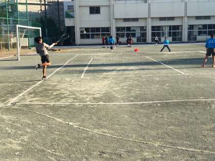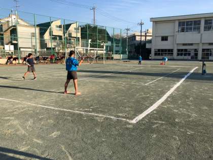 春の日差しを受けて、テニス部が練習しています。当面の目標は、今週末にある大会、ブロック大会出場をめざします。