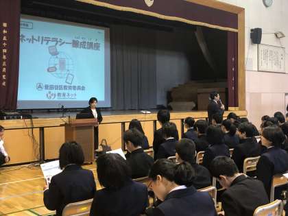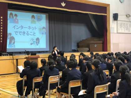 全校生徒および保護者を対象に、教育ネットサポートセンターから講師をお呼びして、ネットリテラシー醸成講座が行われました。はじめにインターネットの仕組みについてのお話がありました。