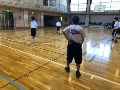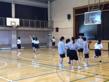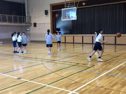 土曜授業の午後、部活動が活発に行われています。バスケ部は、明日が区大会。男女に分かれて練習をしています。仮入部の1年生を、上級生が丁寧に教えています。