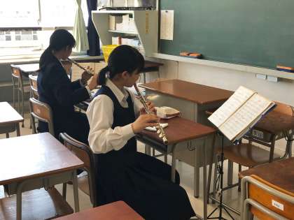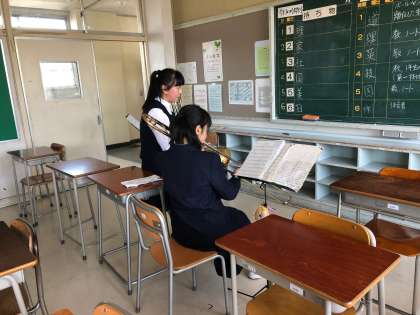 吹奏楽部のパート練習、フルートとトロンボーンの練習風景です。同じパートの仲間と、お互いにアドバイスしあって練習を進めていました。素晴らしいですね。