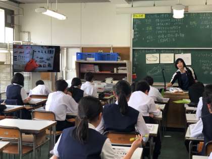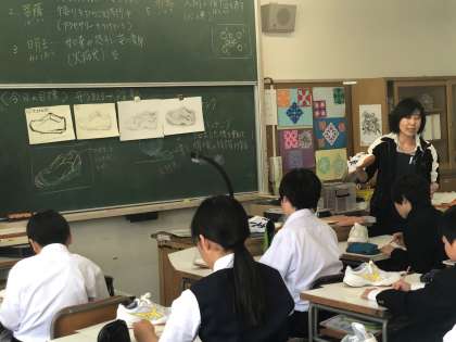 1年生の美術の授業では、自分の履いている靴のデッサンをしています。書架カメラで写し出された画像を参考に先生が作業の説明をした後、デッサンに入ります。今日の目標は、「形をとって陰影を出す」です。生徒たちは、楽しそうに作業を進めています。