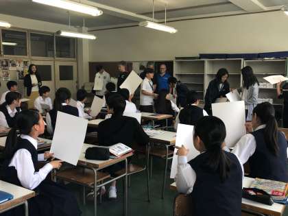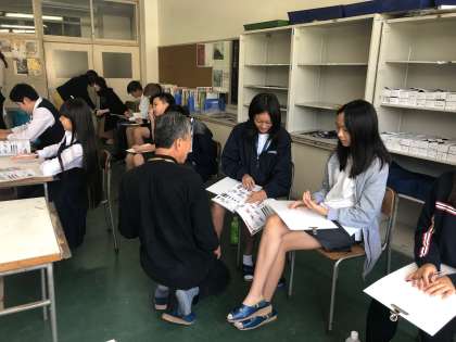 タイ インターナショナルスクールの生徒学校訪問3 公開日 2019/05/13 更新日 2019/05/13 できごと 2校時は、2年生の美術の授業に参加しました。最初に一人ずつ自己紹介をしてもらった後、今日の授業の説明がありました。今日の授業は、「手をデッサンする」という内容です。授業の最後には、お互いに描いたデッサンを見せ合いました。