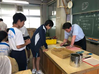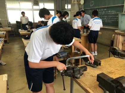 2年生の技術の授業では、金属加工でベン立ての製作を行っています。今日は、けがき線の内側に穴を開けて、糸のこで切り取っていく作業をしていました。金属を切断していくのは大変な作業ですが、生徒たちは頑張っていました。