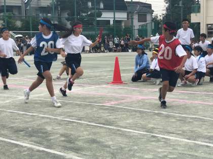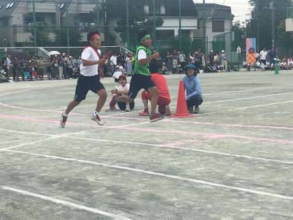 1年生全員リレー、結果は赤、緑、青、黄の順でした。みんな頑張りました。1、2位の勝敗は、ゴールまでもつれ込みました。