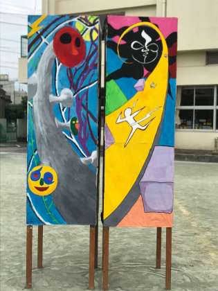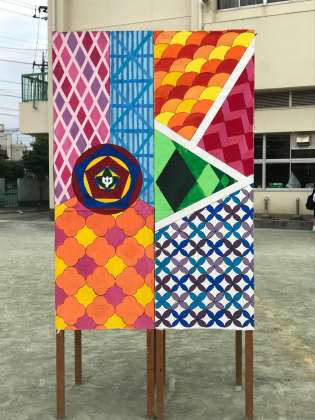 美術部 入退場門3 公開日 2019/06/01 更新日 2019/06/01 できごと 最後は正面を飾った幾何学模様と岡本太郎をテーマにした作品です。 幾何学模様の中央には、松沢中の校章が入っています。校章の緑と、赤、青、黄の四色でマークを作りました。