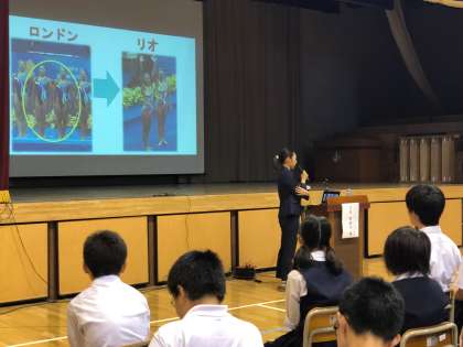 オリンピック・パラリンピック講演会3 公開日 2019/06/08 更新日 2019/06/08 できごと ロンドンオリンピックから、リオデジャネイロオリンピックまで「変わるために」どんなふうに体を鍛え、私生活や練習をどんな考え方で過ごしたかというお話も聞くことができました。