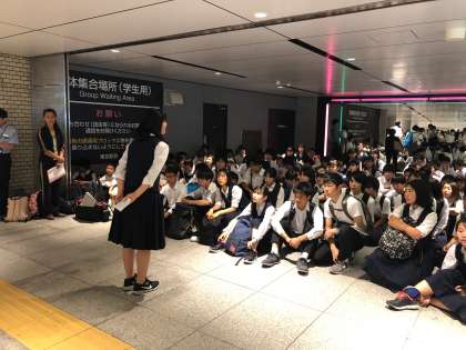 時間どおりに集合できました。出発式を行なっています。実行委員長のあいさつです。
