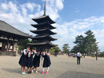 興福寺の国宝館を見学しました。五重の塔の前で。空がとてもきれいです。