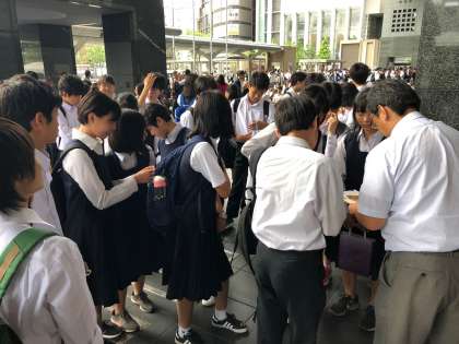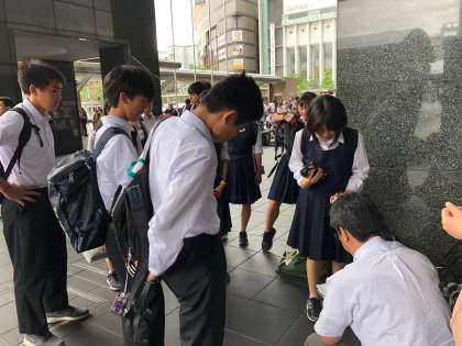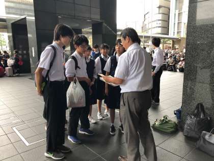 タクシー班行動を終えて、予定通り続々と生徒が戻ってきます。結局班行動中雨は降りませんでした。