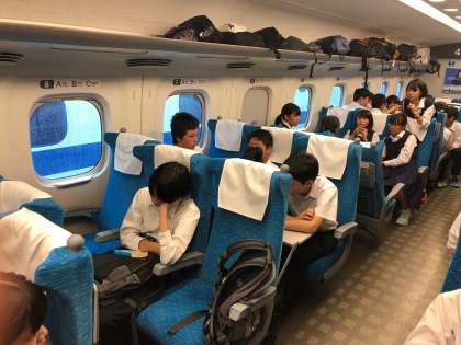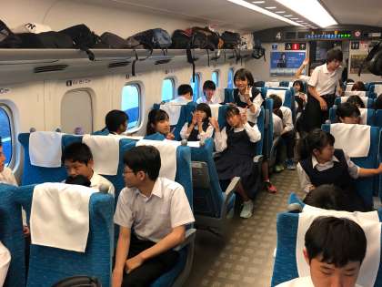 名古屋に着きました。外は、大粒の雨が降っています。生徒たちは元気で思い思いに過ごしています。