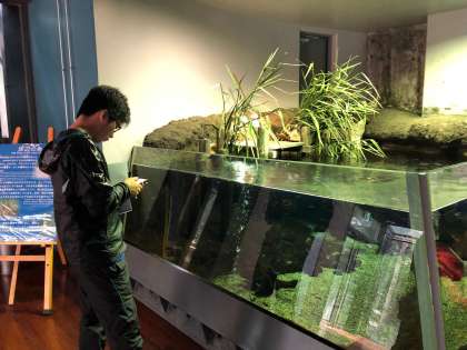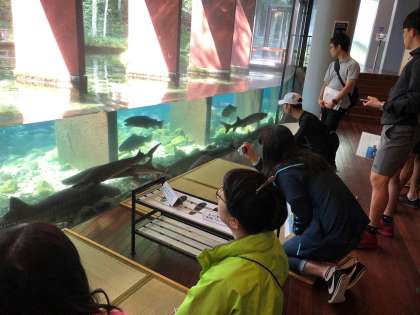 本隊をどんなコースで廻るか、いろいろな施設・見学地を見てまわるのが合同実地踏査です。湧水の里水族館です。