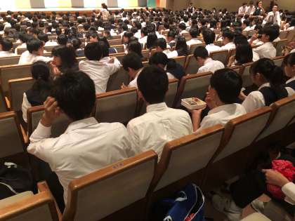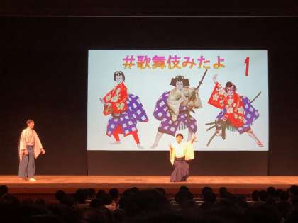 3年生歌舞伎鑑賞教室 公開日 2019/07/08 更新日 2019/07/08 できごと 始めに、「歌舞伎のみかた」ということで、歌舞伎に使われる道具や、今日の公演についての詳しい説明がありました。舞台スクリーンに映しだされた画像を写真撮影する時間などもとられ、わかりやすい説明でした。短い昼食タイムをはさんで、いよいよ歌舞伎の演目が始まります