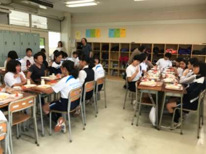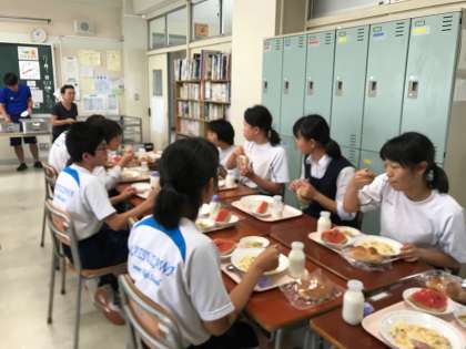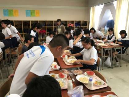 ときわ学級 交流給食の様子 公開日 2019/07/12 更新日 2019/07/11 ときわ学級 7月9日、10日、11日と続けて交流給食がありました。 先日の全校朝会での呼びかけが功を奏したのか、沢山の生徒が来てくれました。 各クラス6名の募集をしました。 写真は3ーAの生徒たちが来てくれた様子です。