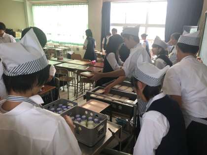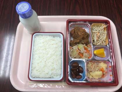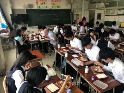 今日からお弁当給食 公開日 2019/09/03 更新日 2019/09/03 できごと 太子堂調理場が改修工事をするため、これから半年間は、お弁当給食となります。今日の献立は、ごはん、油淋鶏、キャベツソテー、じゃがいものそぼろ煮、ごぼうサラダ、金時豆、オレンジでした。3Cの教室では、ALTのカール先生が生徒の班に混ざって給食を食べていました。さて、食事の量はどうだったかな?