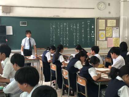 2年生の国語では、文学作品を通して、作品の構成や登場人物の描写から人柄や心情を読み取る学習をしています。今日は、四人一つのグループになって、意見を述べ合うグループ学習を中心に授業が展開されました。生徒たちは、熱心に話し合いを進めていました。