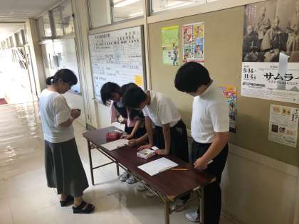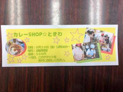 「カレーショップ☆ときわ」オープン 公開日 2019/09/05 更新日 2019/09/05 ときわ学級 中間考査二日目の9月20日、いつも調理実習で鍛えている腕前を発揮して、ときわ学級の生徒たちが「カレーショップ☆ときわ」をオープンします。お客様は、先生方です。今日の昼休みに、生徒たちが「売主」となり、チケットを販売しました。「美味しいカレーですよ〜」と、言いながら、楽しそうにチケットを販売していました。当日が楽しみです!