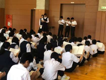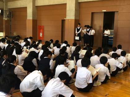 1年生河口湖移動教室に向けて 公開日 2019/09/20 更新日 2019/09/20 できごと 23日から始まる河口湖移動教室に向けて、最後の学年集会が行われています。実行委員が中心になって会を進行しています。