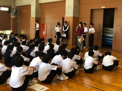 1年生河口湖移動教室に向けて 公開日 2019/09/20 更新日 2019/09/20 できごと 養護教諭の先生から健康管理、食事についての話がありました。健康観察を今日からしっかり行うこと、アレルギーの人もいるので、宿舎で枕投げなどをしてむやみにホコリをたてないこと、現地で具合が悪くなったら、すぐに申し出ること、食事アレルギーの対応についてのお話がありました。健康で安全に過ごすことができるよう、一人ひとりがよく考えて過ごしてください。