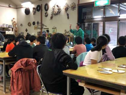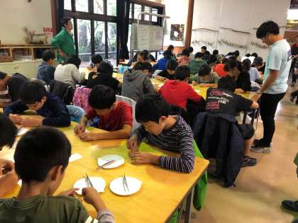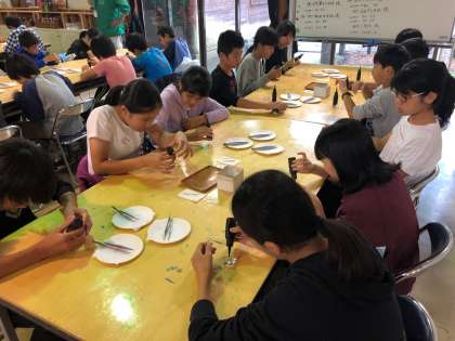 1年生河口湖移動教室(1日め) 公開日 2019/09/23 更新日 2019/09/23 できごと A組とB組の半分は、最初にガイドウォーク、B組の半分とC組は、クラフト体験を先に行います。クラフト体験は、ペーパーウェイトを作ります。みんな真剣です。