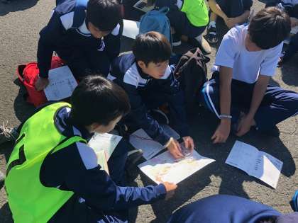 地図の見方とコンパスの使い方を教えていただいています。