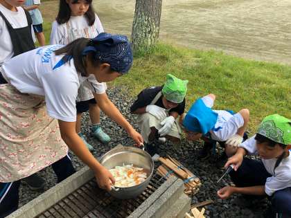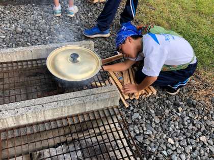 早い班は火を付けたかまどに切った野菜を入れた鍋をセットしました。早い!