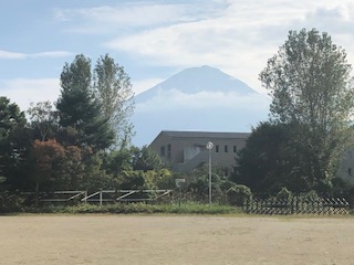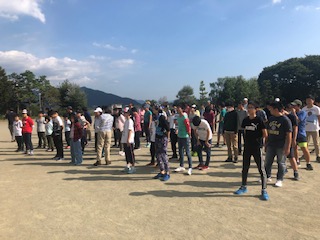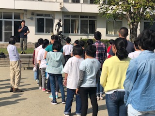 林間学園に着きました。開園式を行なっています。河口湖は、10月とは思えない暑さです。
