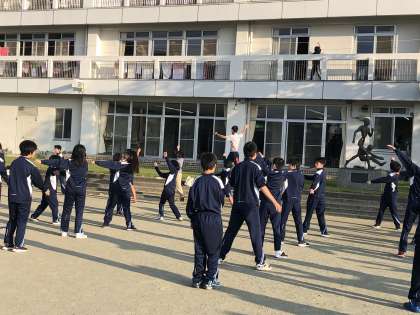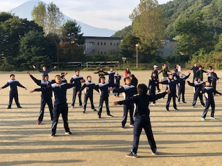朝礼です。ラジオ体操の担当は、松沢中です。