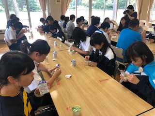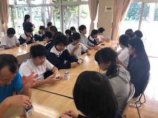 宿舎に着きました。おやつのゼリーと牛乳をいただきます!