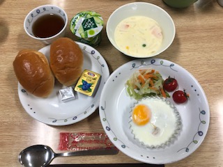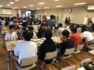 3校そろってみんなで食べる最後の朝食です。生徒代表のあいさつで「いただきます!」