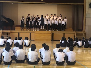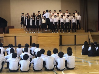 縦割り練習をしました!2 公開日 2019/10/15 更新日 2019/10/15 できごと 体育館で行われた黄色組(3C、2A、1C)の練習風景です。3年生の歌声は圧倒されます。2年生は美しい歌声を響かせています。1年生は元気いっぱいです。