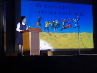 英語科発表の「スピーチ」、「日本文化紹介」、「英語合唱」は、どの発表も思考を凝らしてあり、見応えがありました。「スピーチ」は、流暢な英語で身振り手振りで、堂々と自分の主張を述べていました。