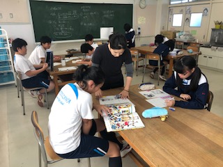 デザインを考えていきます。先生が各テーブルをまわりながらアドバイスしていきます。授業の最後には、みんなで協力して使ったテーブルや教室を掃除します。どんな作品ができるか、楽しみですね!
