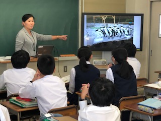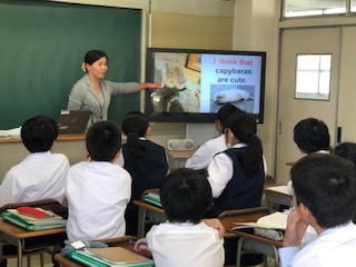 今日の英語の時間は、先生が訪れた動物王国で飼育されている動物の画像を見ながらのSmall Talkから始まりました。可愛い動物の画像を見ながら、英語での会話が続きます。生徒も興味津々です。
