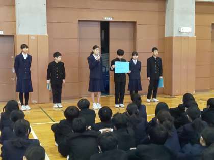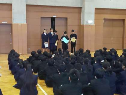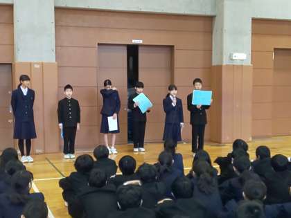 本日は2学期の終業式です。終業式に先がけ各学年で学年集会を行いました。1年生は自治委員の生徒が各学級の学期の反省と今後の課題を発表しました。