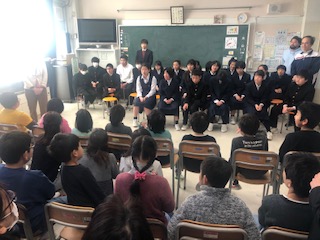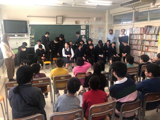 ときわ学級と、世田谷小学校仲よし学級が、小中交流会を行なっています。まずはお互いに自己紹介をし合います。ときわ学級の生徒たちは、小学生を前に、少し恥ずかしそうにしながらもお兄さん、お姉さんらしくしっかり振る舞っています。す