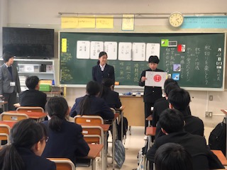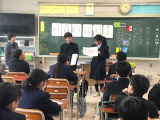 代表者は、自分の作った紋切りを見せながら、なぜ自分がイメージした四字熟語と組み合わせたのか、理由をクラスの仲間に発表しました。発表態度は堂々としていてとても立派でした。理由は、「なるほど」と思えるものばかりで、様々な言葉に興味を持つきっかけになりました。