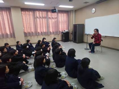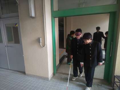 本日、区社会福祉協議会の方々の協力で、1年生は視覚に障害をもつ人の疑似体験として 2人でペアになり、白杖とアイマスクを使って校舎内を歩く体験をしました。普段利用している校舎内でさえ、アイマスクをしながら歩くことの不安を生徒は肌で感じることが出来ました。