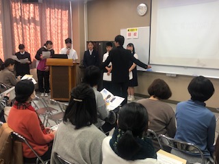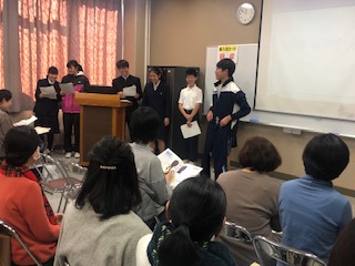 説明会の途中には、生徒会役員がモデルになって、標準服や体育着の説明もあり、説明会会場には、温かい雰囲気が流れました。